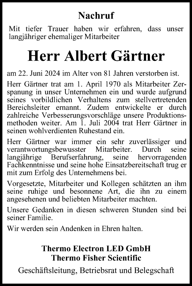 Hier finden Sie alle Traueranzeigen aus der Zeitung, die bisher für Albert Gärtner erschienen sind. Weitere Traueranzeigen, die in der Zeitung erscheinen, werden hier ebenfalls aufgelistet