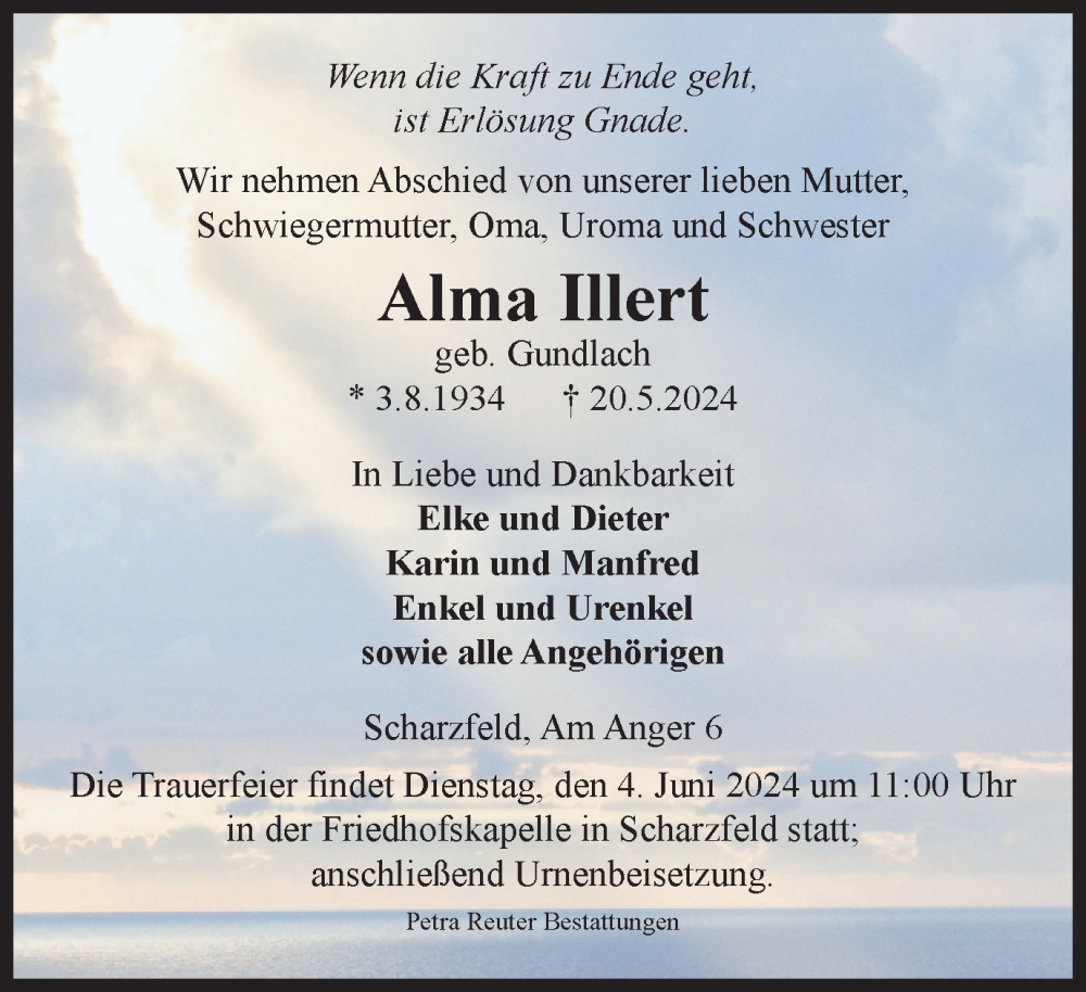 Hier finden Sie alle Traueranzeigen aus der Zeitung, die bisher für Alma Illert erschienen sind. Weitere Traueranzeigen, die in der Zeitung erscheinen, werden hier ebenfalls aufgelistet