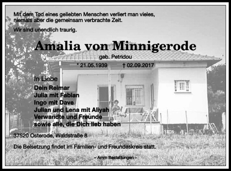 Hier finden Sie alle Traueranzeigen aus der Zeitung, die bisher für Amalia von Minnigerode erschienen sind. Weitere Traueranzeigen, die in der Zeitung erscheinen, werden hier ebenfalls aufgelistet