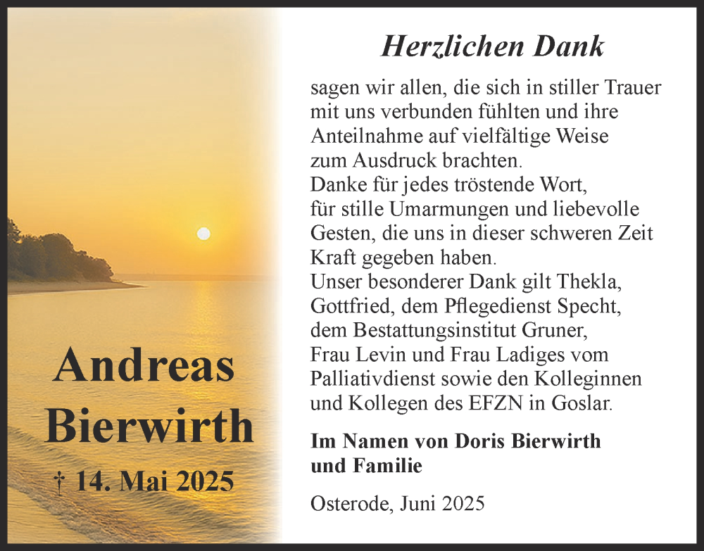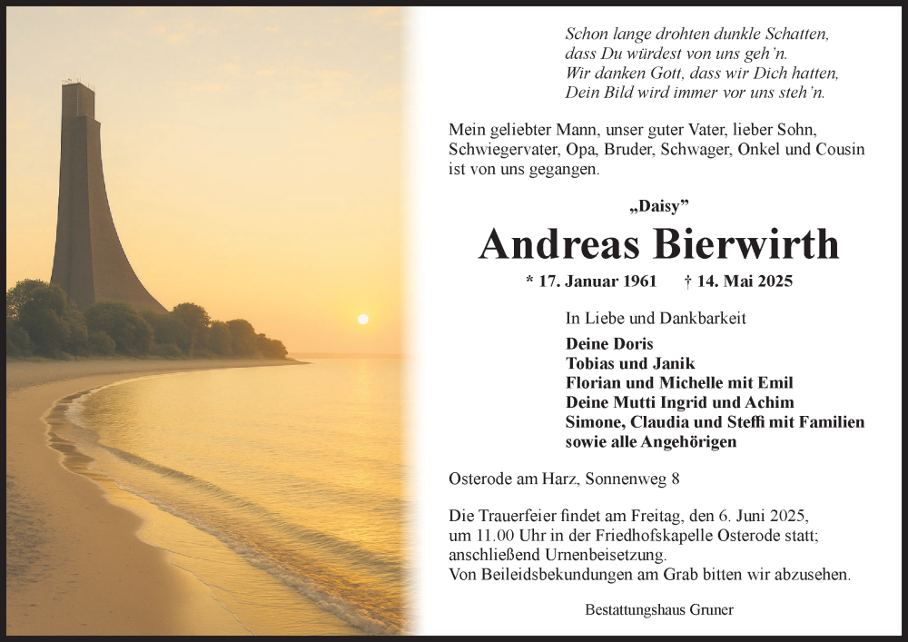 Hier finden Sie alle Traueranzeigen aus der Zeitung, die bisher für Andreas Bierwirth erschienen sind. Weitere Traueranzeigen, die in der Zeitung erscheinen, werden hier ebenfalls aufgelistet