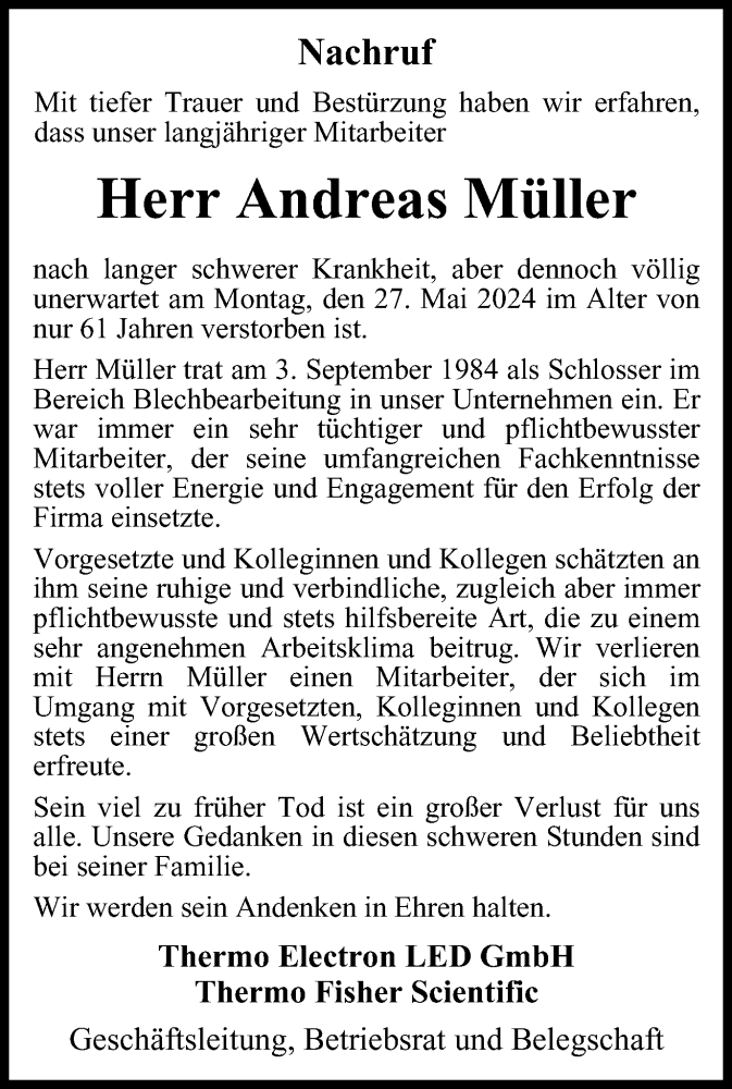 Hier finden Sie alle Traueranzeigen aus der Zeitung, die bisher für Andreas Müller erschienen sind. Weitere Traueranzeigen, die in der Zeitung erscheinen, werden hier ebenfalls aufgelistet