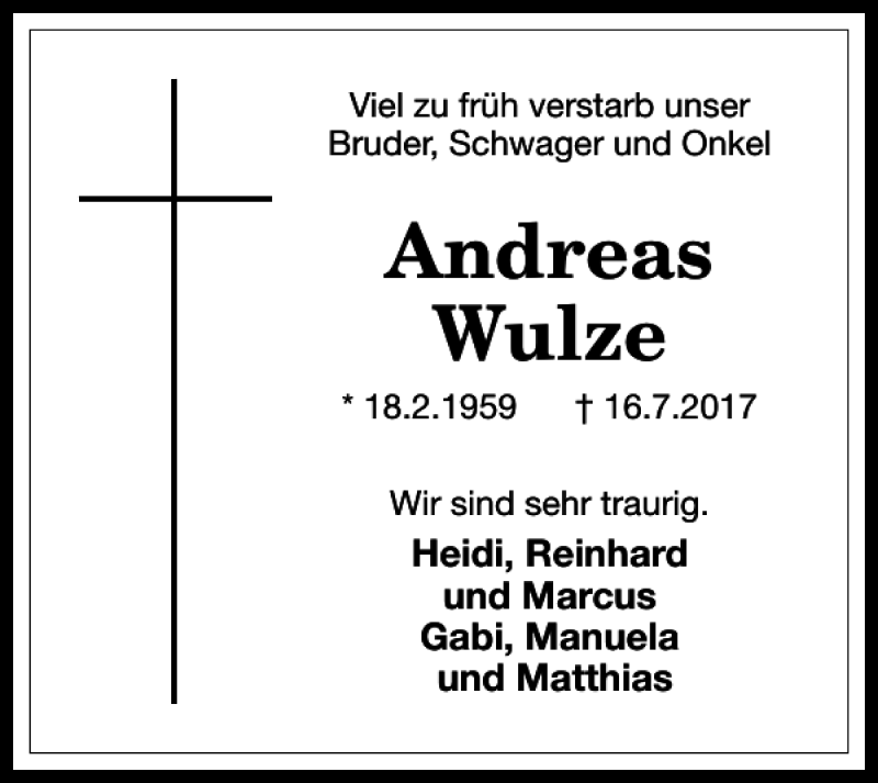 Hier finden Sie alle Traueranzeigen aus der Zeitung, die bisher für Andreas Wulze erschienen sind. Weitere Traueranzeigen, die in der Zeitung erscheinen, werden hier ebenfalls aufgelistet