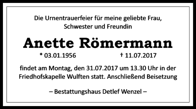 Hier finden Sie alle Traueranzeigen aus der Zeitung, die bisher für Anette Römermann erschienen sind. Weitere Traueranzeigen, die in der Zeitung erscheinen, werden hier ebenfalls aufgelistet