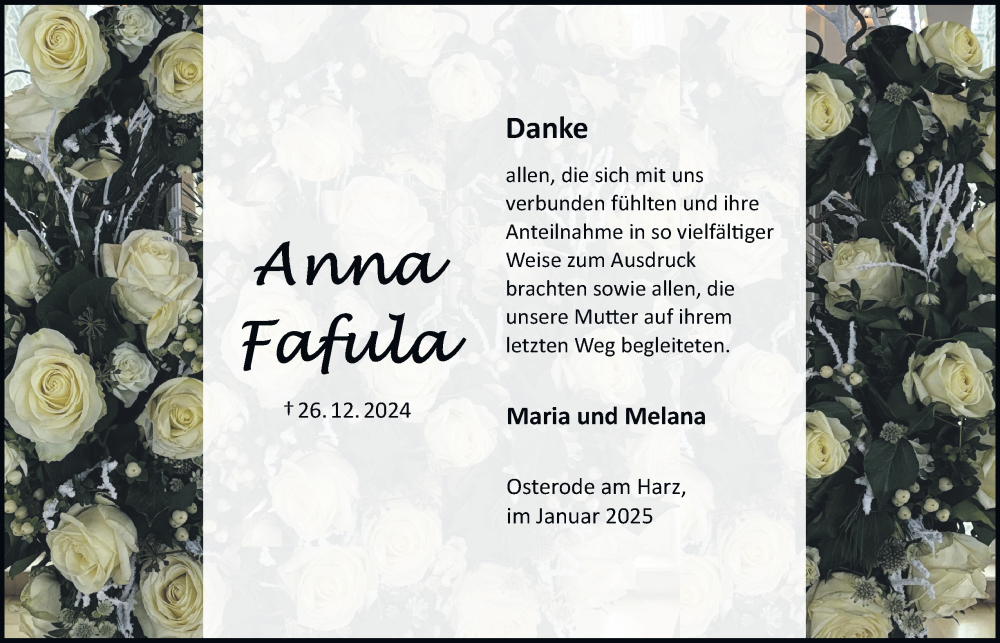 Hier finden Sie alle Traueranzeigen aus der Zeitung, die bisher für Anna Fafula erschienen sind. Weitere Traueranzeigen, die in der Zeitung erscheinen, werden hier ebenfalls aufgelistet
