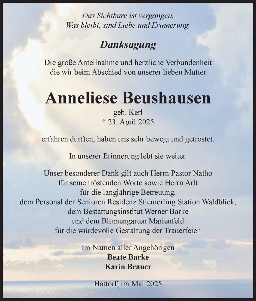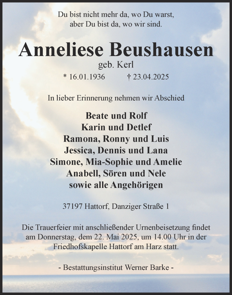 Hier finden Sie alle Traueranzeigen aus der Zeitung, die bisher für Anneliese Beushausen erschienen sind. Weitere Traueranzeigen, die in der Zeitung erscheinen, werden hier ebenfalls aufgelistet