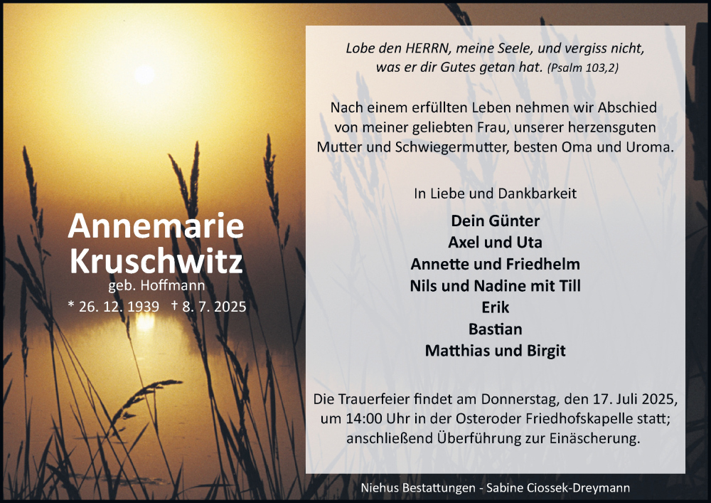 Hier finden Sie alle Traueranzeigen aus der Zeitung, die bisher für Annemarie Kruschwitz erschienen sind. Weitere Traueranzeigen, die in der Zeitung erscheinen, werden hier ebenfalls aufgelistet