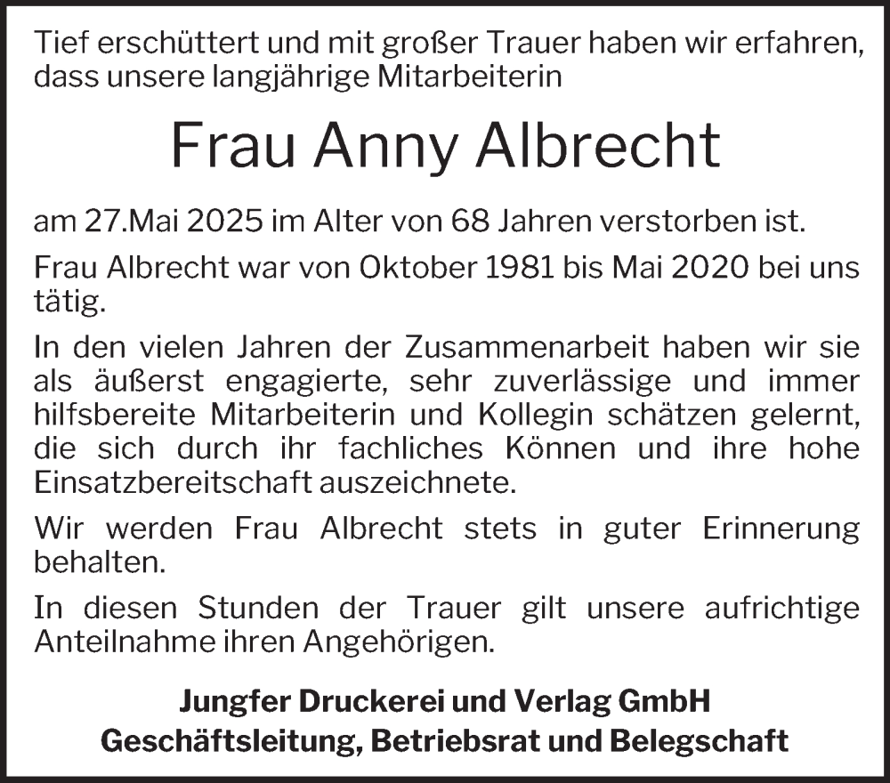 Hier finden Sie alle Traueranzeigen aus der Zeitung, die bisher für Anny Albrecht erschienen sind. Weitere Traueranzeigen, die in der Zeitung erscheinen, werden hier ebenfalls aufgelistet