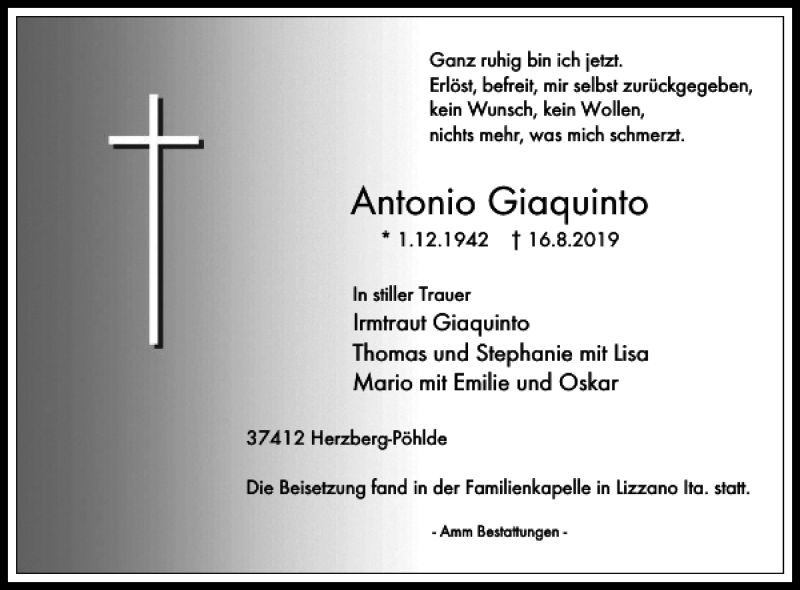 Hier finden Sie alle Traueranzeigen aus der Zeitung, die bisher für Antonio Giaquinto erschienen sind. Weitere Traueranzeigen, die in der Zeitung erscheinen, werden hier ebenfalls aufgelistet