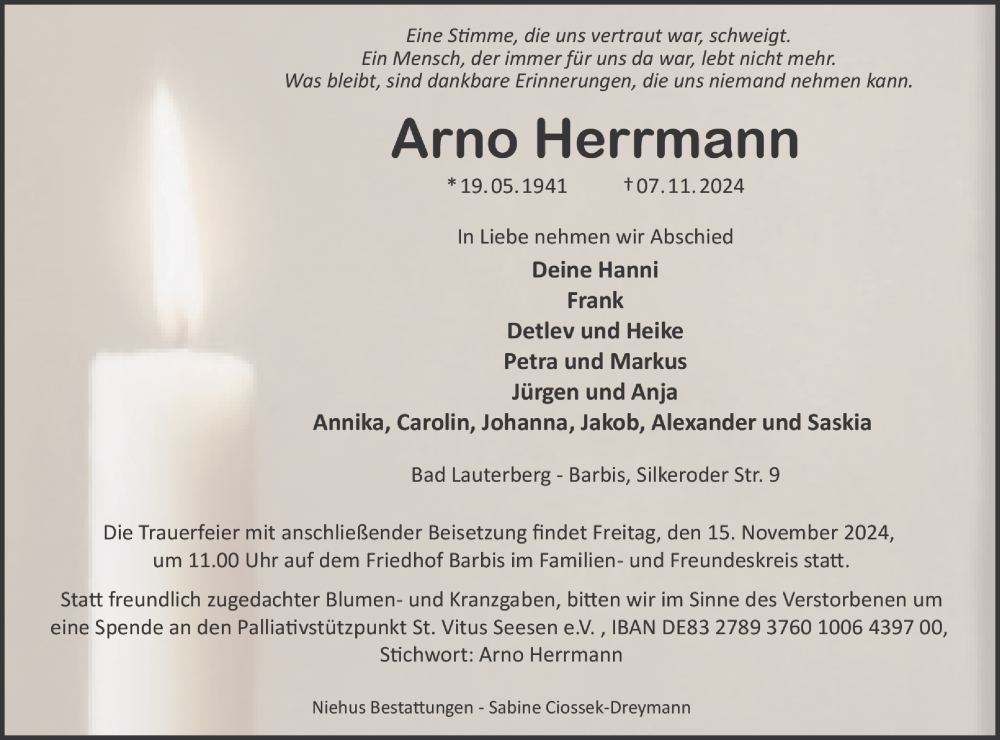 Hier finden Sie alle Traueranzeigen aus der Zeitung, die bisher für Arno Herrmann erschienen sind. Weitere Traueranzeigen, die in der Zeitung erscheinen, werden hier ebenfalls aufgelistet