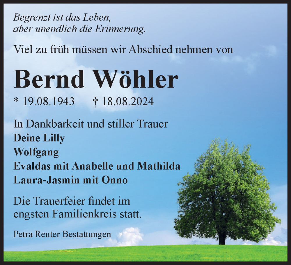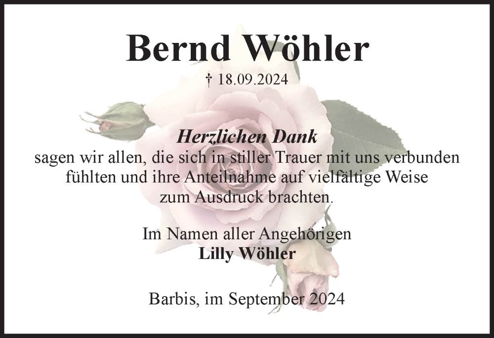 Hier finden Sie alle Traueranzeigen aus der Zeitung, die bisher für Bernd Wöhler erschienen sind. Weitere Traueranzeigen, die in der Zeitung erscheinen, werden hier ebenfalls aufgelistet