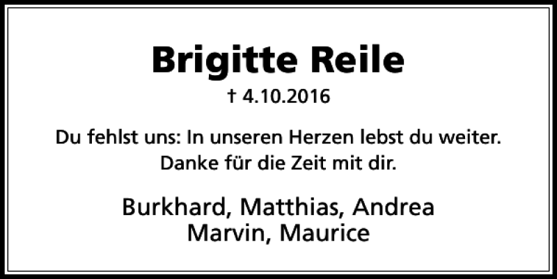 Hier finden Sie alle Traueranzeigen aus der Zeitung, die bisher für Brigitte Reile erschienen sind. Weitere Traueranzeigen, die in der Zeitung erscheinen, werden hier ebenfalls aufgelistet
