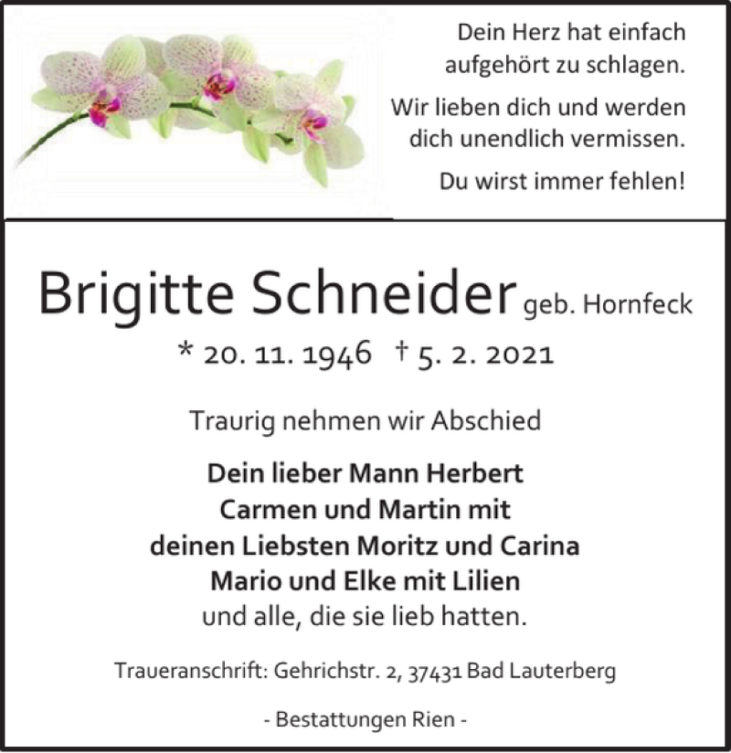 Hier finden Sie alle Traueranzeigen aus der Zeitung, die bisher für Brigitte Schneider erschienen sind. Weitere Traueranzeigen, die in der Zeitung erscheinen, werden hier ebenfalls aufgelistet