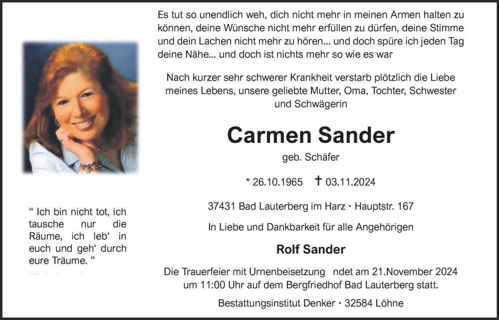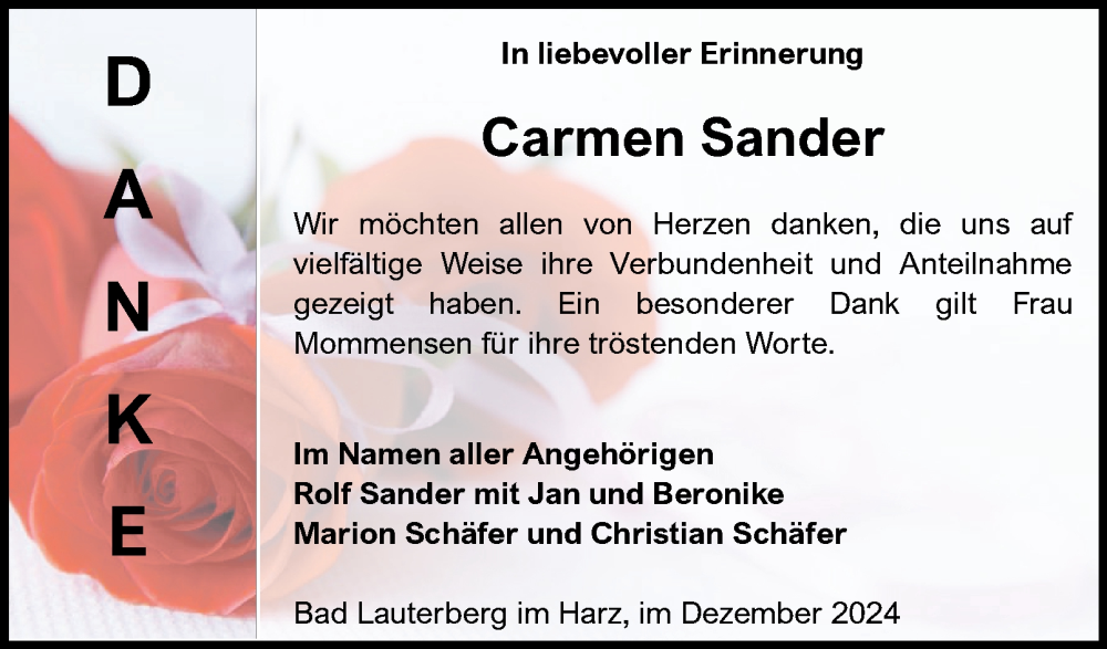 Hier finden Sie alle Traueranzeigen aus der Zeitung, die bisher für Carmen Sander erschienen sind. Weitere Traueranzeigen, die in der Zeitung erscheinen, werden hier ebenfalls aufgelistet