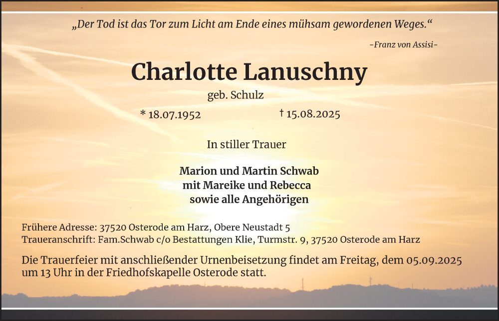 Hier finden Sie alle Traueranzeigen aus der Zeitung, die bisher für Charlotte Lanuschny erschienen sind. Weitere Traueranzeigen, die in der Zeitung erscheinen, werden hier ebenfalls aufgelistet