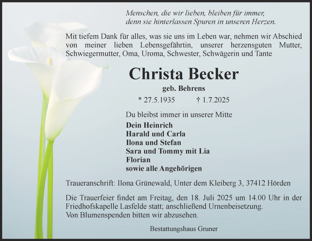 Hier finden Sie alle Traueranzeigen aus der Zeitung, die bisher für Christa Becker erschienen sind. Weitere Traueranzeigen, die in der Zeitung erscheinen, werden hier ebenfalls aufgelistet