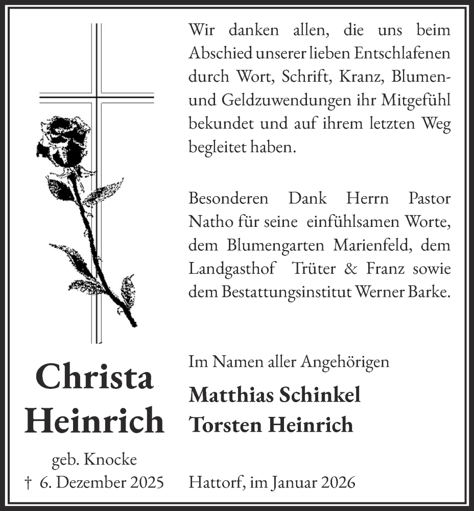Hier finden Sie alle Traueranzeigen aus der Zeitung, die bisher für Christa Heinrich erschienen sind. Weitere Traueranzeigen, die in der Zeitung erscheinen, werden hier ebenfalls aufgelistet