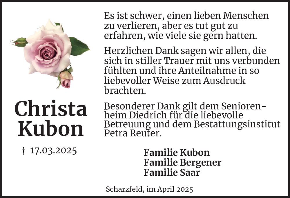 Hier finden Sie alle Traueranzeigen aus der Zeitung, die bisher für Christa Kubon erschienen sind. Weitere Traueranzeigen, die in der Zeitung erscheinen, werden hier ebenfalls aufgelistet