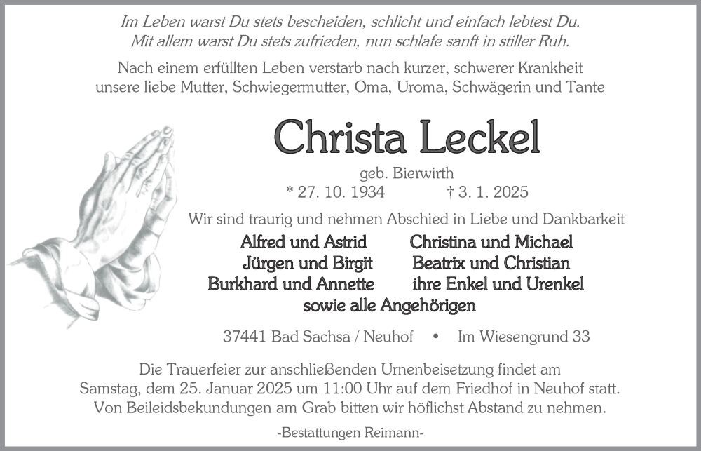 Hier finden Sie alle Traueranzeigen aus der Zeitung, die bisher für Christa Leckel erschienen sind. Weitere Traueranzeigen, die in der Zeitung erscheinen, werden hier ebenfalls aufgelistet