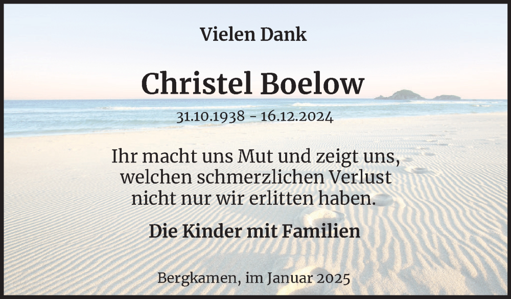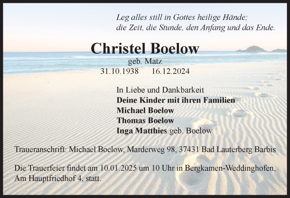 Hier finden Sie alle Traueranzeigen aus der Zeitung, die bisher für Christel Boelow erschienen sind. Weitere Traueranzeigen, die in der Zeitung erscheinen, werden hier ebenfalls aufgelistet
