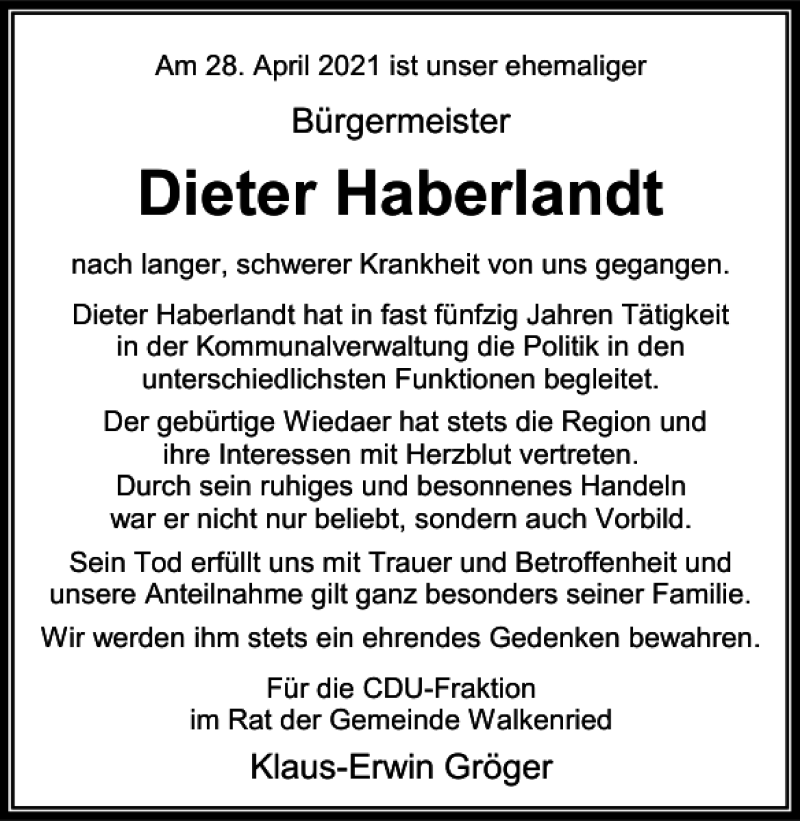 Hier finden Sie alle Traueranzeigen aus der Zeitung, die bisher für Dieter Haberlandt erschienen sind. Weitere Traueranzeigen, die in der Zeitung erscheinen, werden hier ebenfalls aufgelistet