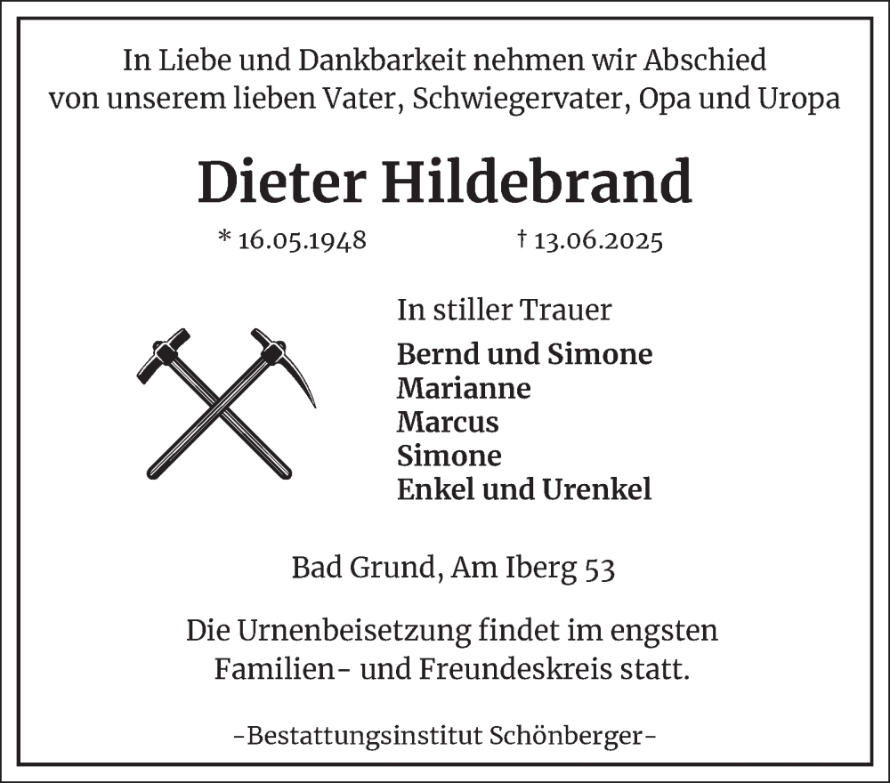 Hier finden Sie alle Traueranzeigen aus der Zeitung, die bisher für Dieter Hildebrand erschienen sind. Weitere Traueranzeigen, die in der Zeitung erscheinen, werden hier ebenfalls aufgelistet