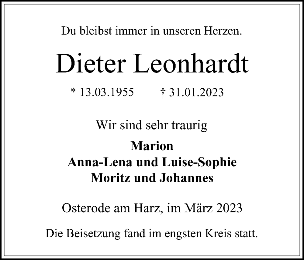 Hier finden Sie alle Traueranzeigen aus der Zeitung, die bisher für Dieter Leonhardt erschienen sind. Weitere Traueranzeigen, die in der Zeitung erscheinen, werden hier ebenfalls aufgelistet