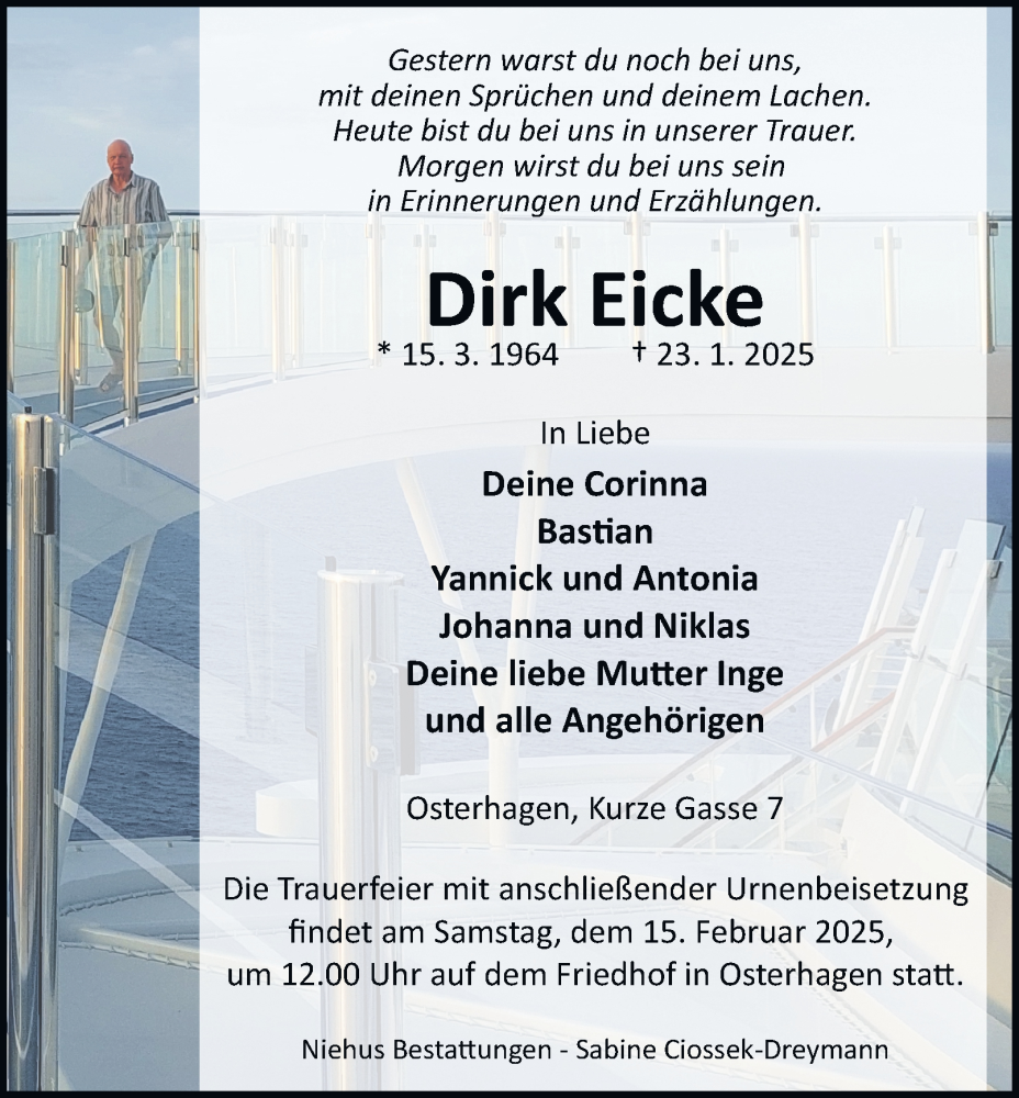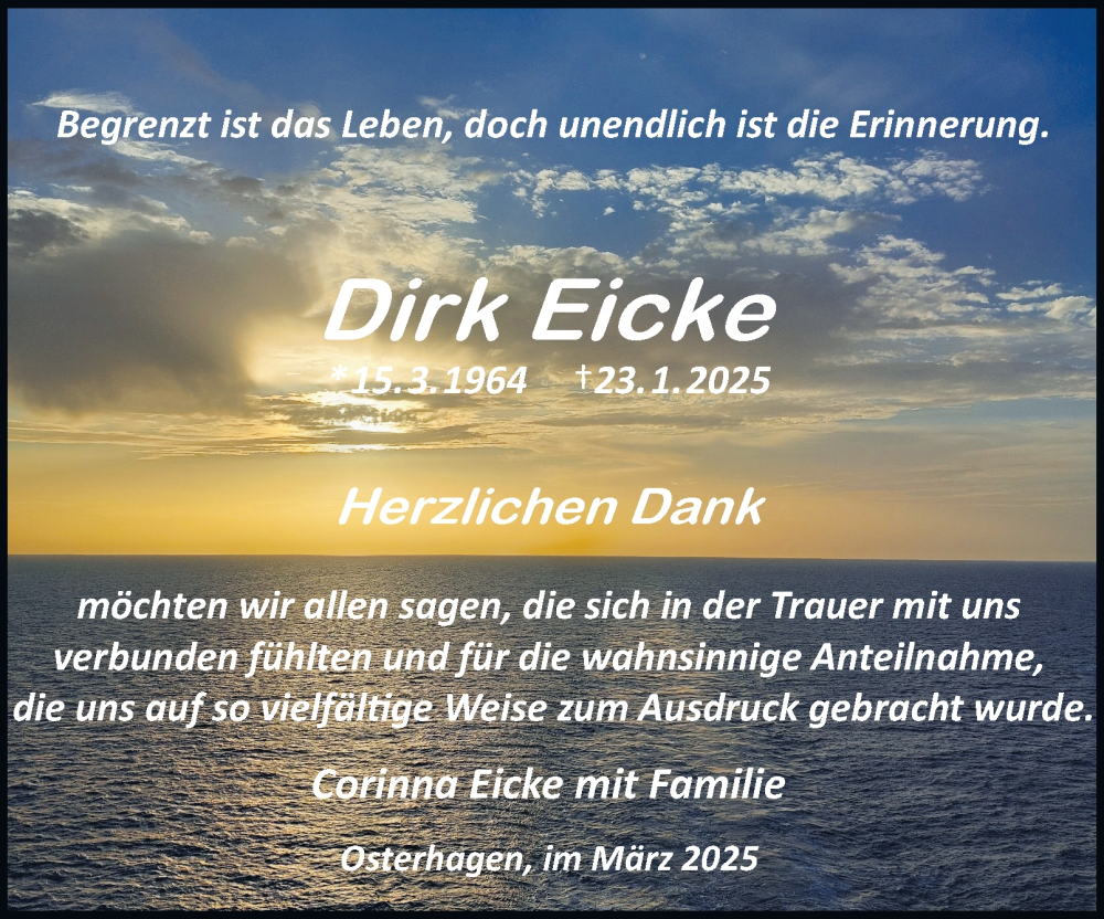 Hier finden Sie alle Traueranzeigen aus der Zeitung, die bisher für Dirk Eicke erschienen sind. Weitere Traueranzeigen, die in der Zeitung erscheinen, werden hier ebenfalls aufgelistet