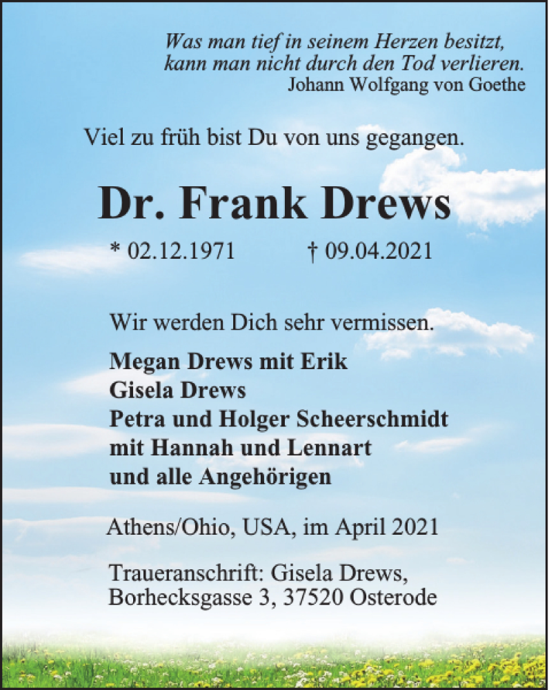 Hier finden Sie alle Traueranzeigen aus der Zeitung, die bisher für Dr. Frank Drews erschienen sind. Weitere Traueranzeigen, die in der Zeitung erscheinen, werden hier ebenfalls aufgelistet