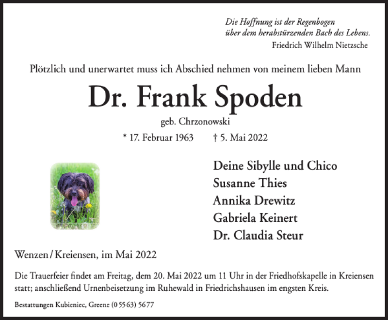 Hier finden Sie alle Traueranzeigen aus der Zeitung, die bisher für Dr. Frank Spoden erschienen sind. Weitere Traueranzeigen, die in der Zeitung erscheinen, werden hier ebenfalls aufgelistet