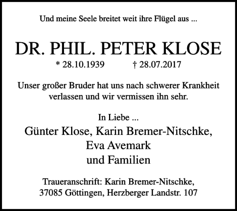 Hier finden Sie alle Traueranzeigen aus der Zeitung, die bisher für DR. PHIL. PETER KLOSE erschienen sind. Weitere Traueranzeigen, die in der Zeitung erscheinen, werden hier ebenfalls aufgelistet