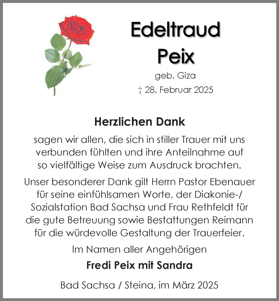 Hier finden Sie alle Traueranzeigen aus der Zeitung, die bisher für Edeltraud Peix erschienen sind. Weitere Traueranzeigen, die in der Zeitung erscheinen, werden hier ebenfalls aufgelistet