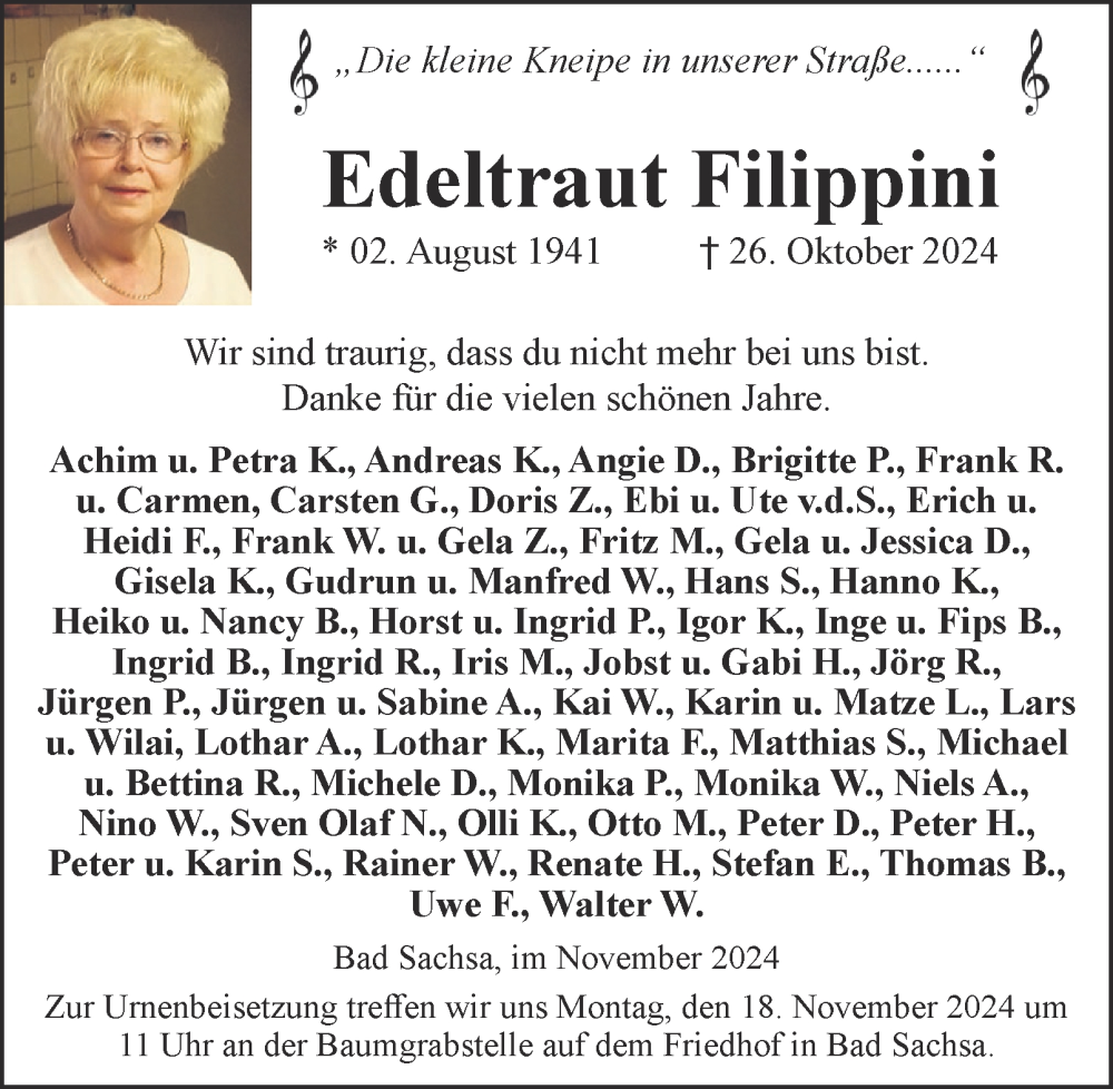 Hier finden Sie alle Traueranzeigen aus der Zeitung, die bisher für Edeltraut Filippini erschienen sind. Weitere Traueranzeigen, die in der Zeitung erscheinen, werden hier ebenfalls aufgelistet