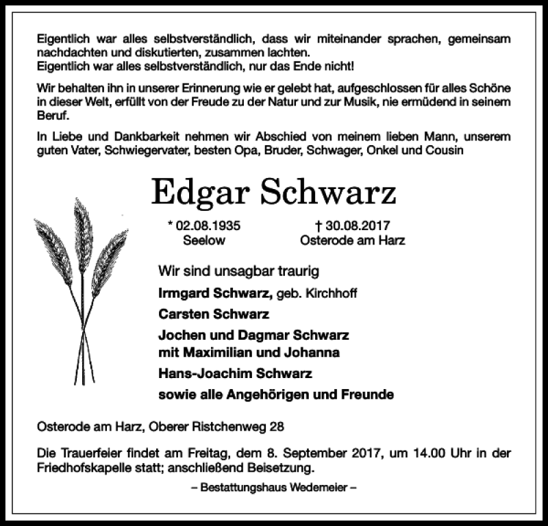 Hier finden Sie alle Traueranzeigen aus der Zeitung, die bisher für Edgar Schwarz erschienen sind. Weitere Traueranzeigen, die in der Zeitung erscheinen, werden hier ebenfalls aufgelistet