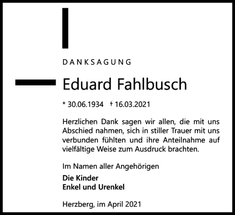 Hier finden Sie alle Traueranzeigen aus der Zeitung, die bisher für Eduard Fahlbusch erschienen sind. Weitere Traueranzeigen, die in der Zeitung erscheinen, werden hier ebenfalls aufgelistet