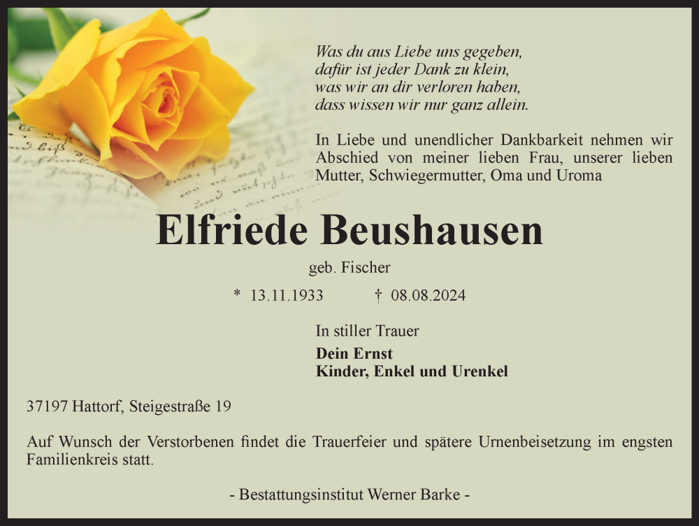 Hier finden Sie alle Traueranzeigen aus der Zeitung, die bisher für Elfriede Beushausen erschienen sind. Weitere Traueranzeigen, die in der Zeitung erscheinen, werden hier ebenfalls aufgelistet