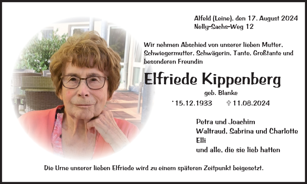 Hier finden Sie alle Traueranzeigen aus der Zeitung, die bisher für Elfriede Kippenberg erschienen sind. Weitere Traueranzeigen, die in der Zeitung erscheinen, werden hier ebenfalls aufgelistet