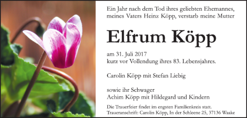 Hier finden Sie alle Traueranzeigen aus der Zeitung, die bisher für Elfrum Köpp erschienen sind. Weitere Traueranzeigen, die in der Zeitung erscheinen, werden hier ebenfalls aufgelistet