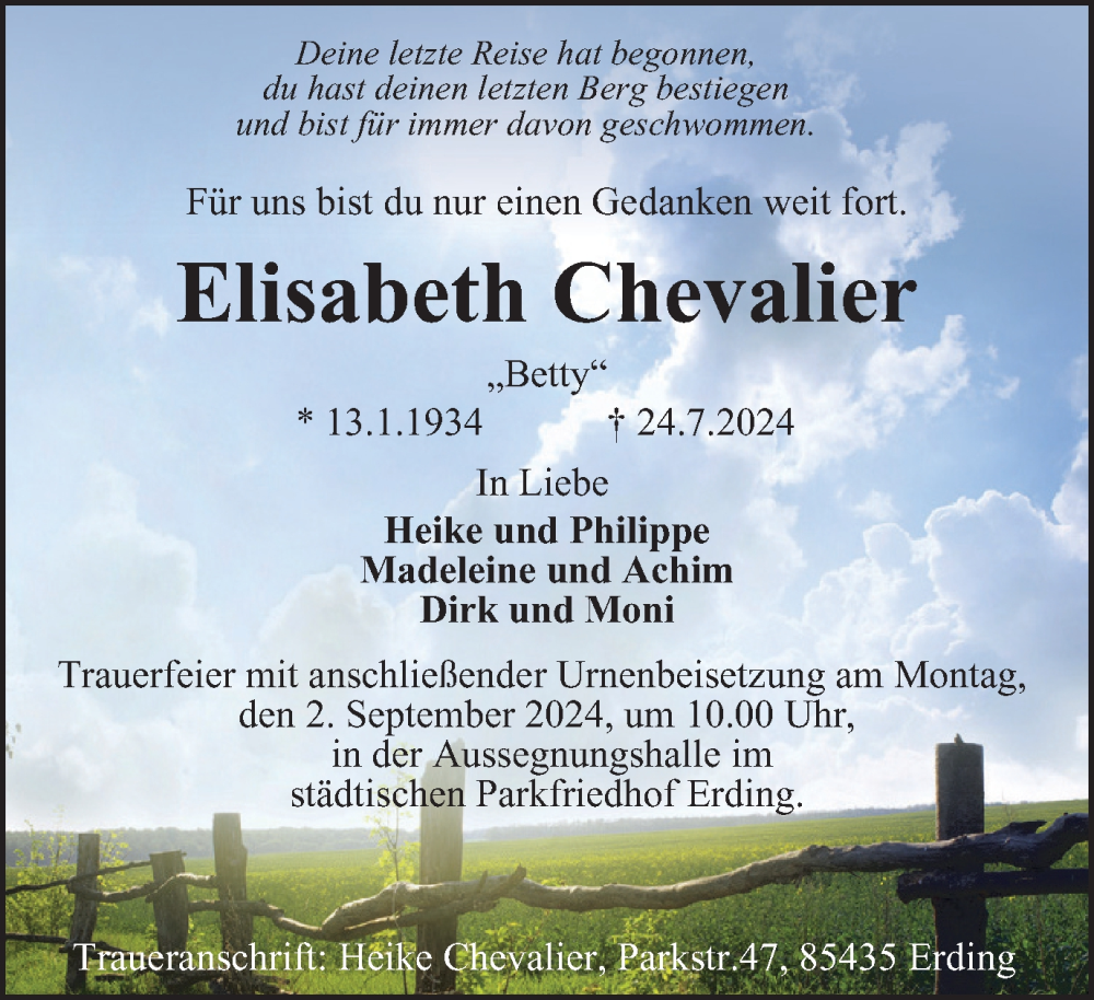 Hier finden Sie alle Traueranzeigen aus der Zeitung, die bisher für Elisabeth Chevalier erschienen sind. Weitere Traueranzeigen, die in der Zeitung erscheinen, werden hier ebenfalls aufgelistet