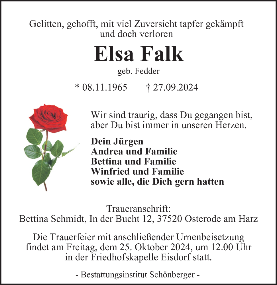 Hier finden Sie alle Traueranzeigen aus der Zeitung, die bisher für Elsa Falk erschienen sind. Weitere Traueranzeigen, die in der Zeitung erscheinen, werden hier ebenfalls aufgelistet