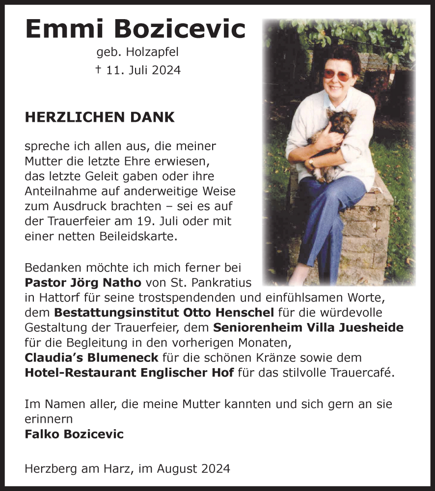 Hier finden Sie alle Traueranzeigen aus der Zeitung, die bisher für Emmi Bozicevic erschienen sind. Weitere Traueranzeigen, die in der Zeitung erscheinen, werden hier ebenfalls aufgelistet