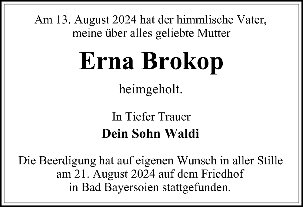 Hier finden Sie alle Traueranzeigen aus der Zeitung, die bisher für Erna Brokop erschienen sind. Weitere Traueranzeigen, die in der Zeitung erscheinen, werden hier ebenfalls aufgelistet