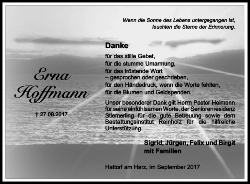 Hier finden Sie alle Traueranzeigen aus der Zeitung, die bisher für Erna Hoffmann erschienen sind. Weitere Traueranzeigen, die in der Zeitung erscheinen, werden hier ebenfalls aufgelistet