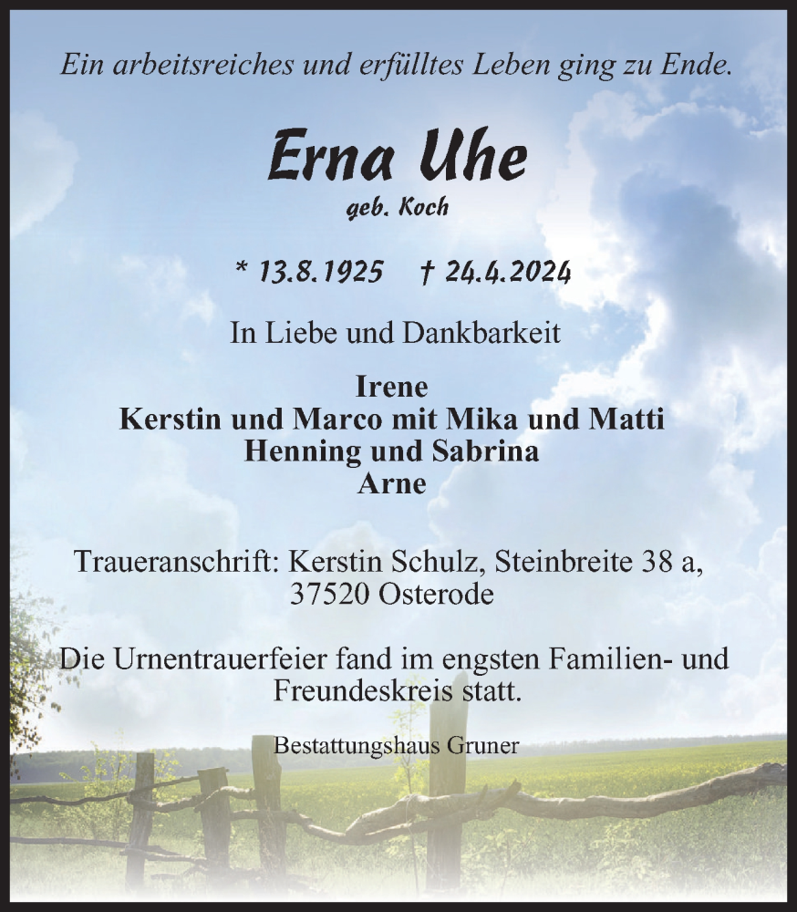 Hier finden Sie alle Traueranzeigen aus der Zeitung, die bisher für Erna Uhe erschienen sind. Weitere Traueranzeigen, die in der Zeitung erscheinen, werden hier ebenfalls aufgelistet