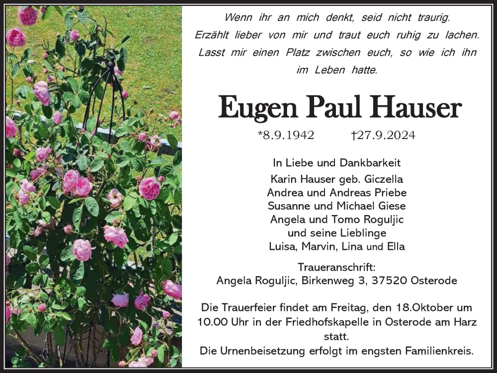 Hier finden Sie alle Traueranzeigen aus der Zeitung, die bisher für Eugen Paul Hauser erschienen sind. Weitere Traueranzeigen, die in der Zeitung erscheinen, werden hier ebenfalls aufgelistet