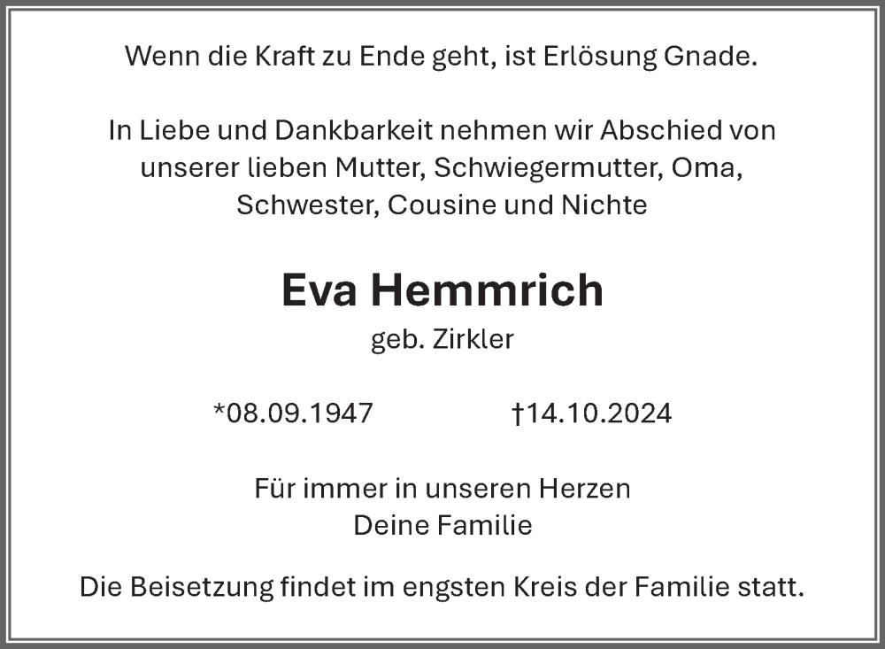 Hier finden Sie alle Traueranzeigen aus der Zeitung, die bisher für Eva Hemmrich erschienen sind. Weitere Traueranzeigen, die in der Zeitung erscheinen, werden hier ebenfalls aufgelistet