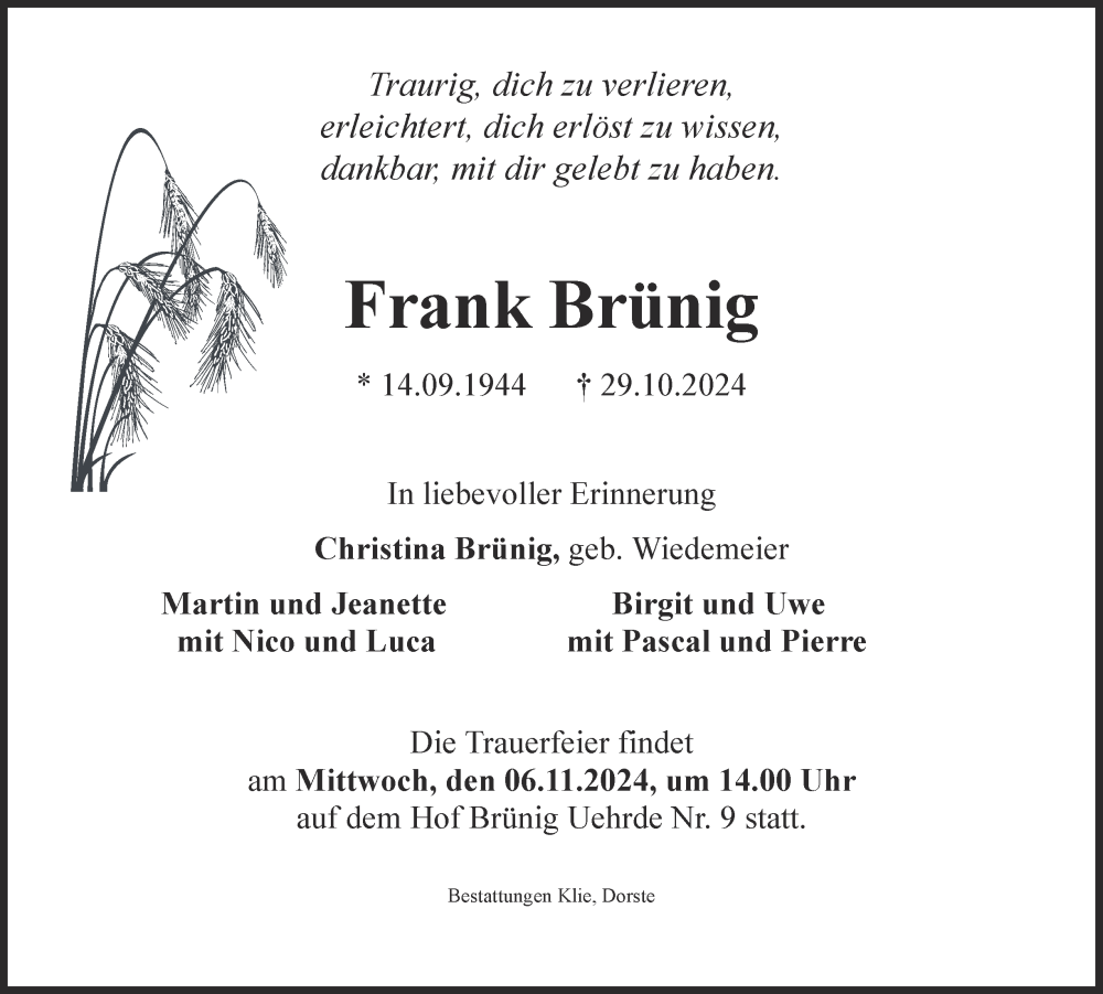 Hier finden Sie alle Traueranzeigen aus der Zeitung, die bisher für Frank Brünig erschienen sind. Weitere Traueranzeigen, die in der Zeitung erscheinen, werden hier ebenfalls aufgelistet