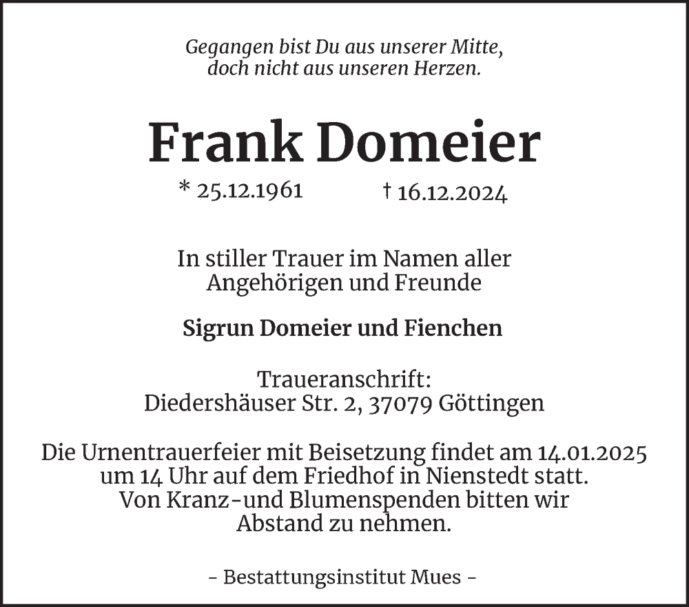 Hier finden Sie alle Traueranzeigen aus der Zeitung, die bisher für Frank Domeier erschienen sind. Weitere Traueranzeigen, die in der Zeitung erscheinen, werden hier ebenfalls aufgelistet