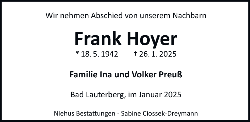 Hier finden Sie alle Traueranzeigen aus der Zeitung, die bisher für Frank Hoyer erschienen sind. Weitere Traueranzeigen, die in der Zeitung erscheinen, werden hier ebenfalls aufgelistet