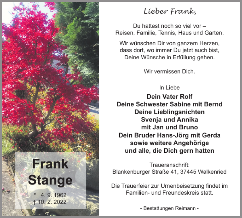 Hier finden Sie alle Traueranzeigen aus der Zeitung, die bisher für Frank Stange erschienen sind. Weitere Traueranzeigen, die in der Zeitung erscheinen, werden hier ebenfalls aufgelistet