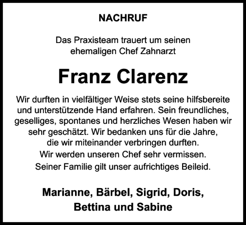 Hier finden Sie alle Traueranzeigen aus der Zeitung, die bisher für Franz Clarenz erschienen sind. Weitere Traueranzeigen, die in der Zeitung erscheinen, werden hier ebenfalls aufgelistet